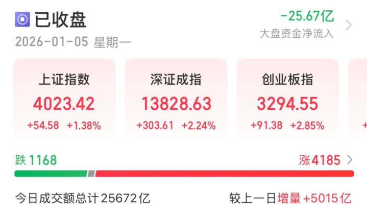 元旦港股提前开市一天,恒生指数大涨2.76%,是2009年以来最大的一个开门红!虽然有委内瑞拉的事,今天A股市场依然高开高走迎来2026年开门红!创业板指领涨,沪指重回4000点上方,录得十二连阳。